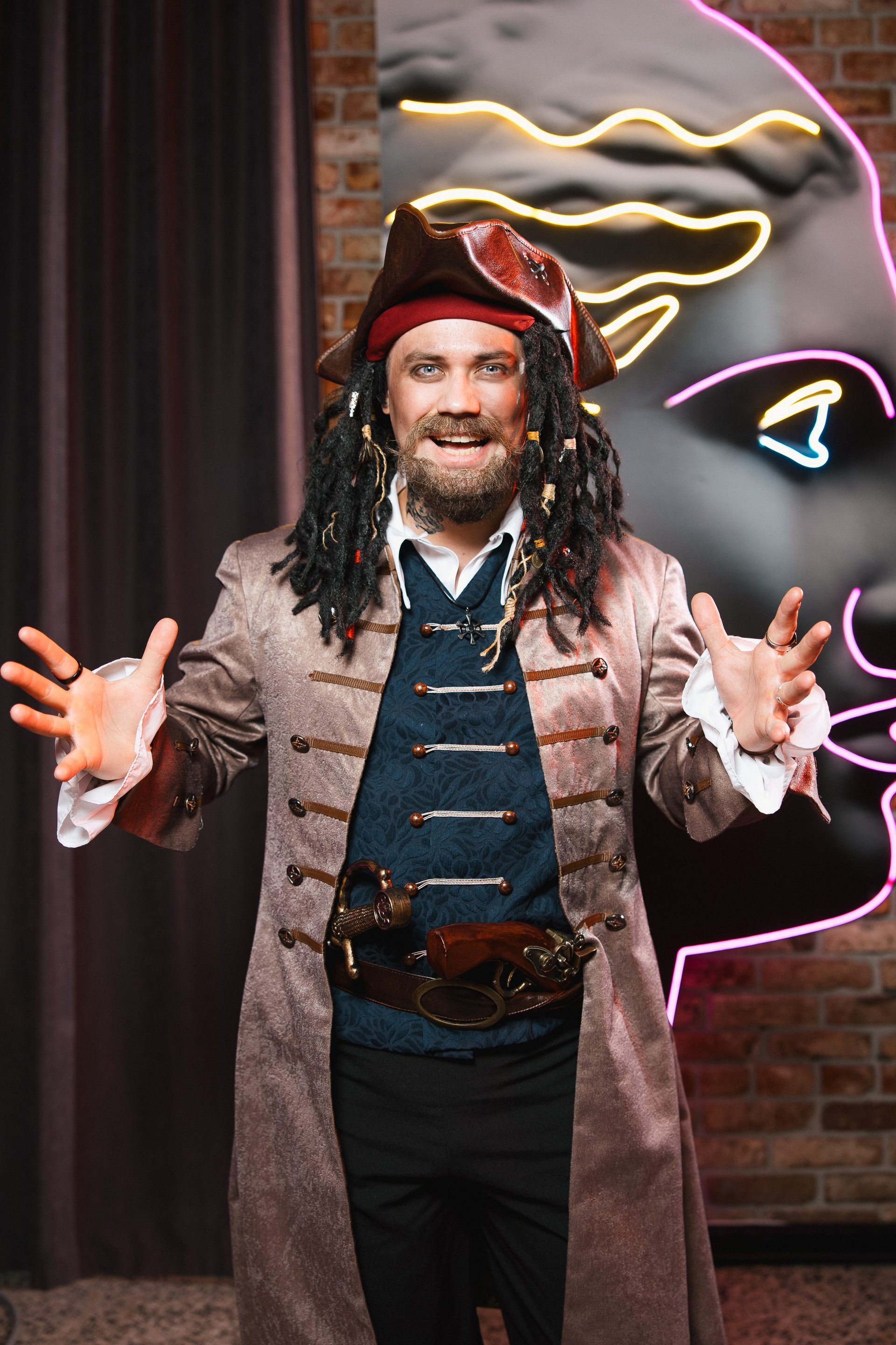 — Хрипловатый голос, будто прошёл сотни штормов — Татуировки на шее, груди и руках — как метки настоящего морского волка — Чёрные ногти и взгляд, в котором прячется тысяча историй — На протяжении всей программы — с бутылкой «рома» (не бойтесь, детский формат!) — Пиратский сленг (6+), от которого у малышей блестят глаза